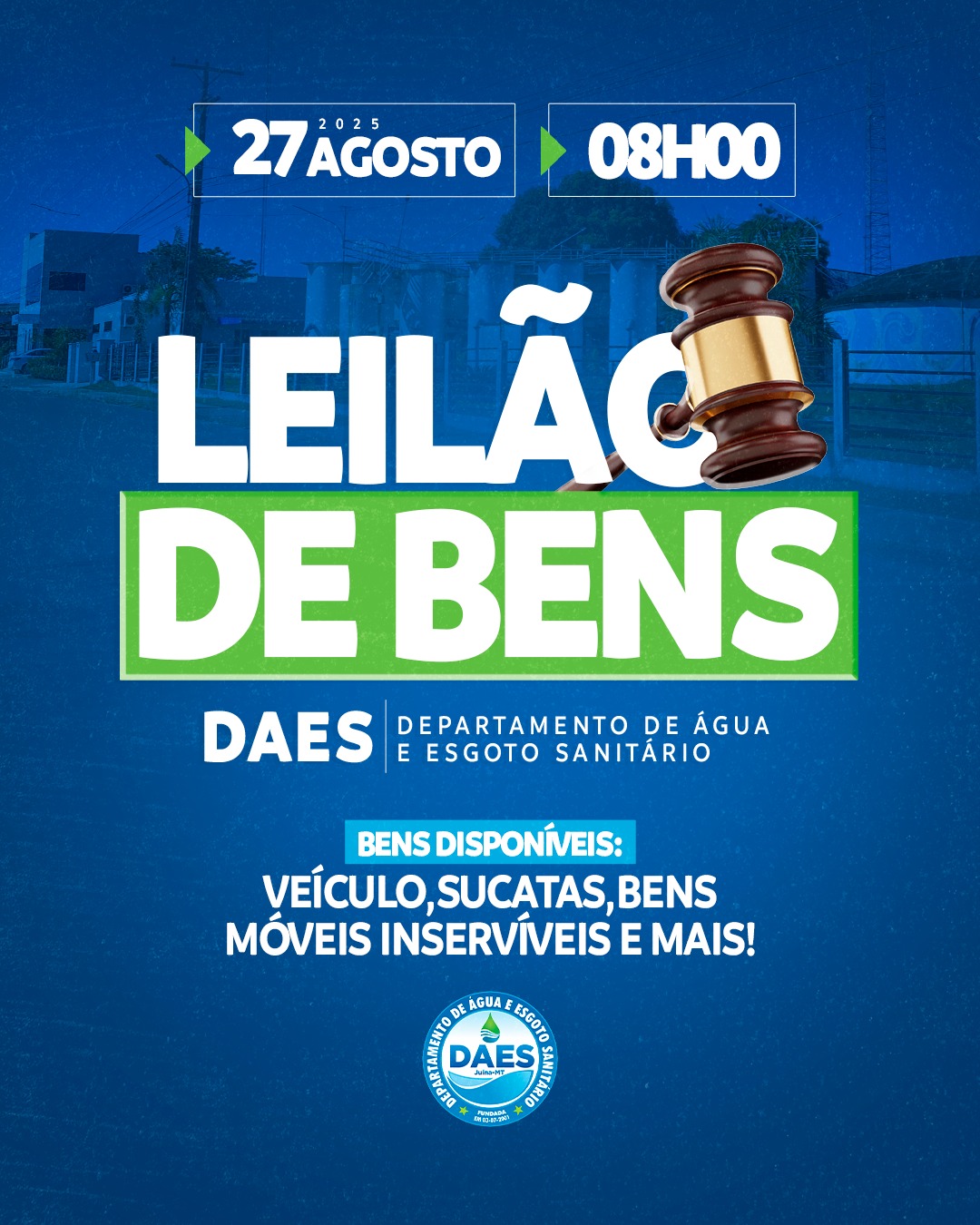 O Departamento de Água e Esgoto Sanitário do Município de Juína - DAES, realizará o LEILÃO PRESENCIAL DE BENS MOVEIS INSERVÍVEIS, por LOTE, na data do Dia 27 De Agosto De 2025 as 08:00 Horas (Horário Local), nas dependências da Sinfra, maiores informações no Telefone - WhatsApp (66) 9 8436-2264.